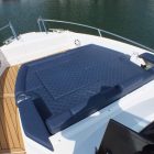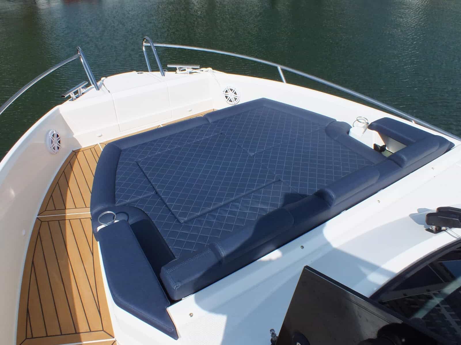 Enjoy access to the Bow Sun Lounge through the Portside walkthrough of the Sorrento. With secure handrails on both sides, this area provides a space to embrace the outdoors and relax at anchor. The Sorrento’s generous beam allows for a spacious social area, comfortably accommodating 2–3 adults. The lounge is elegantly finished with high-quality fabrics, enhancing the comfort of this area.