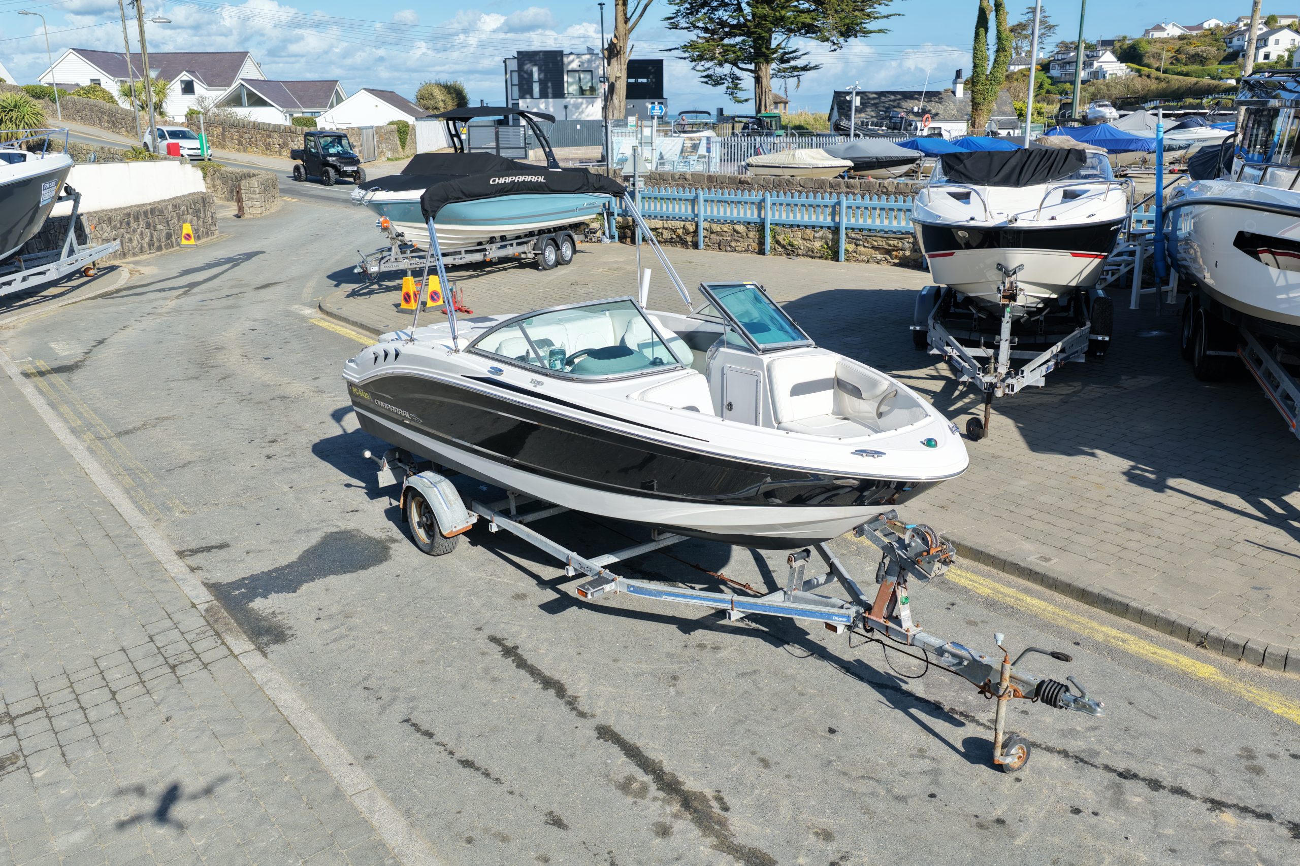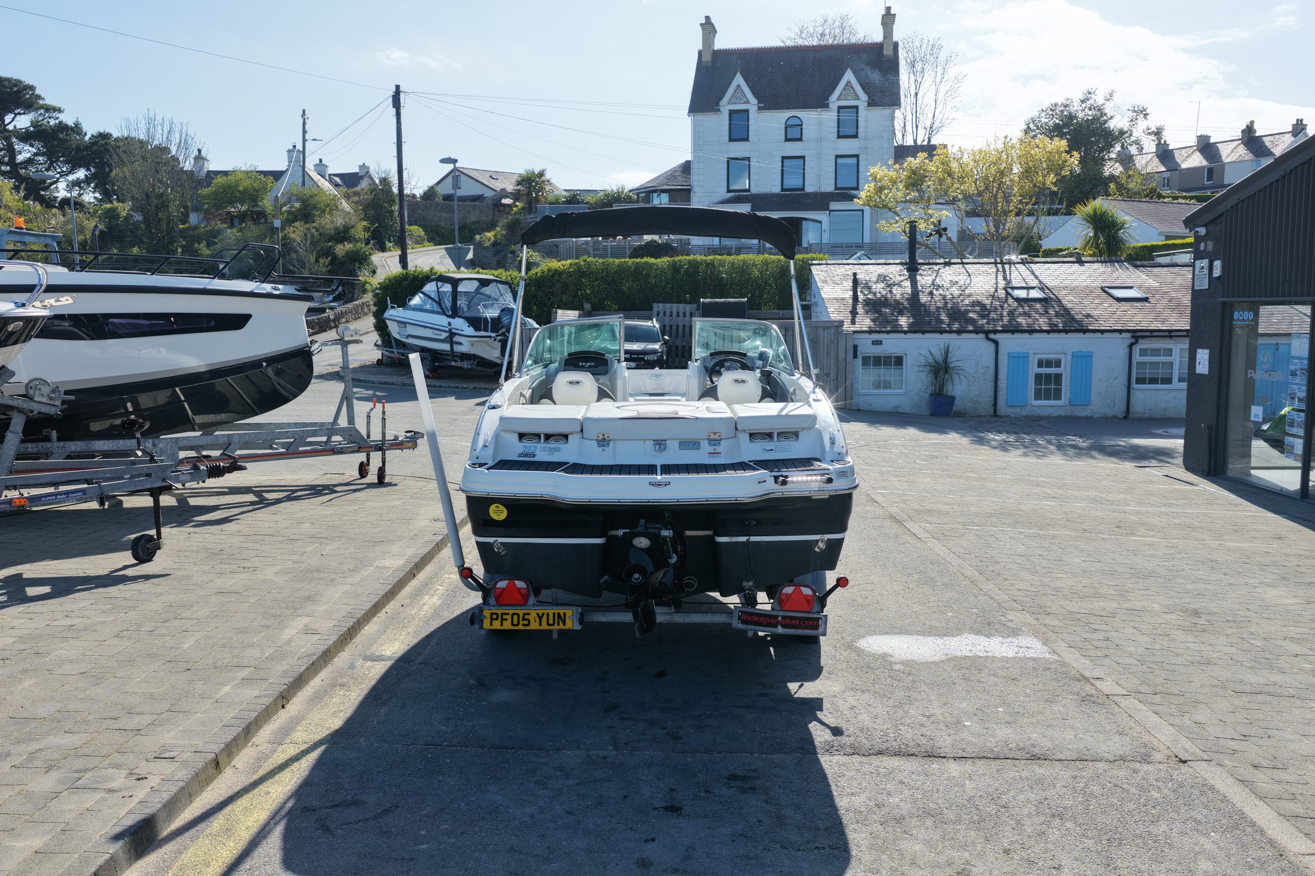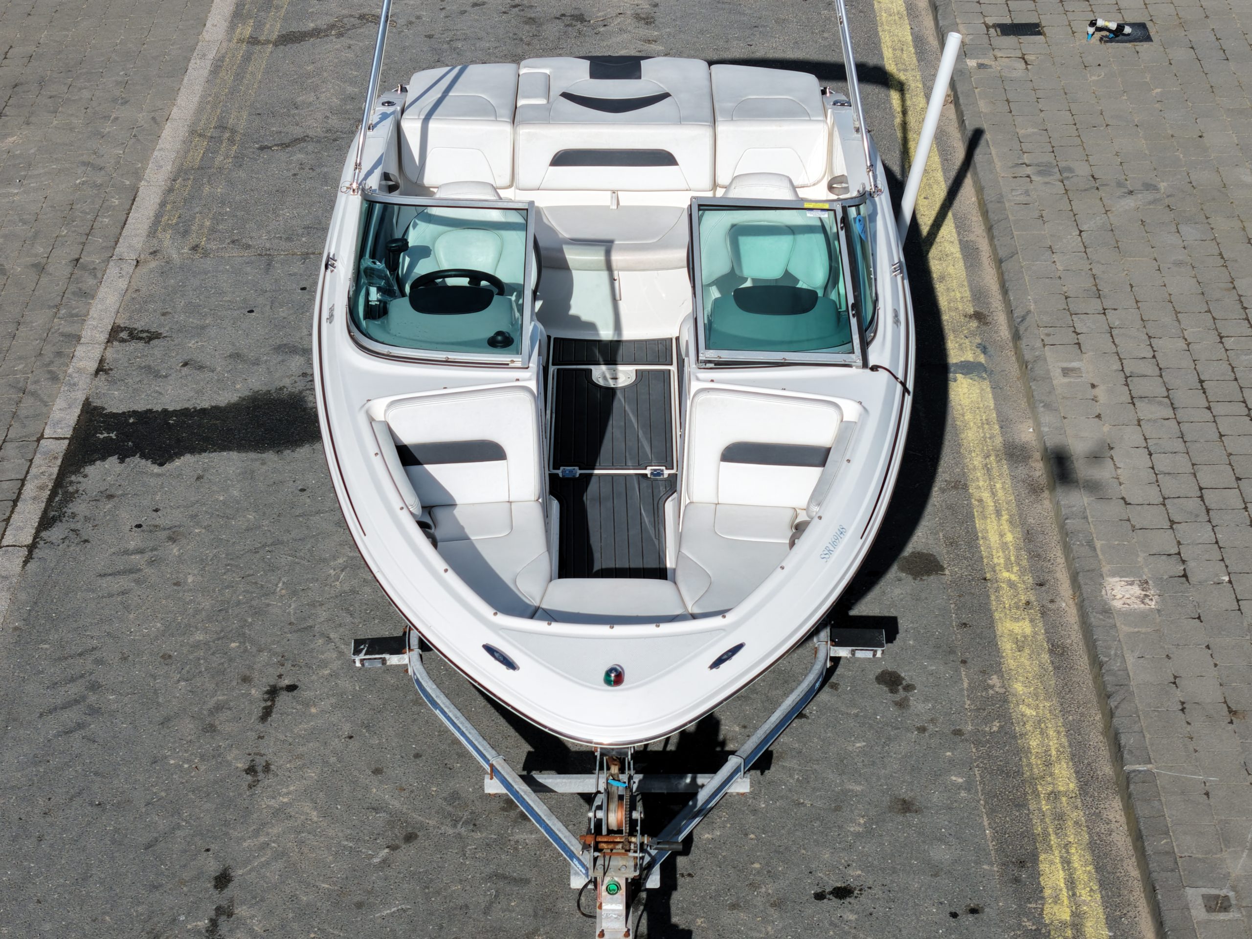 It features grey EVA foam faux teak flooring throughout, which not only gives it a clean, modern look but is also comfortable and hard-wearing. The boat is fitted with a Garmin navigation system and fish finder, making it a useful setup whether you’re exploring or spending time fishing.
