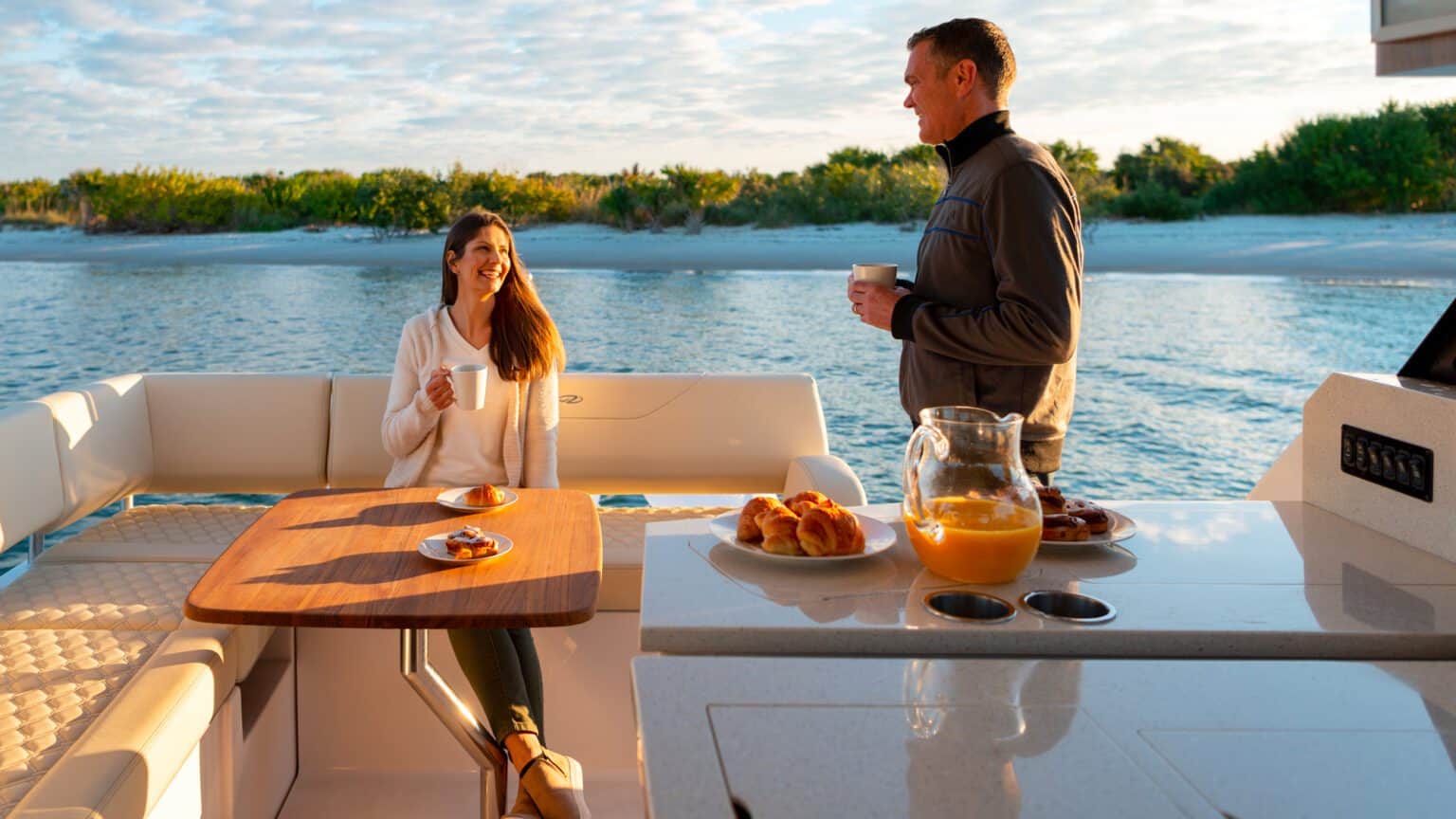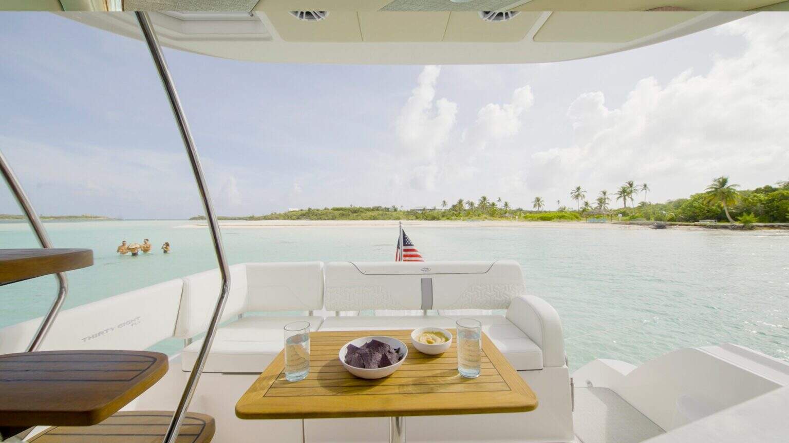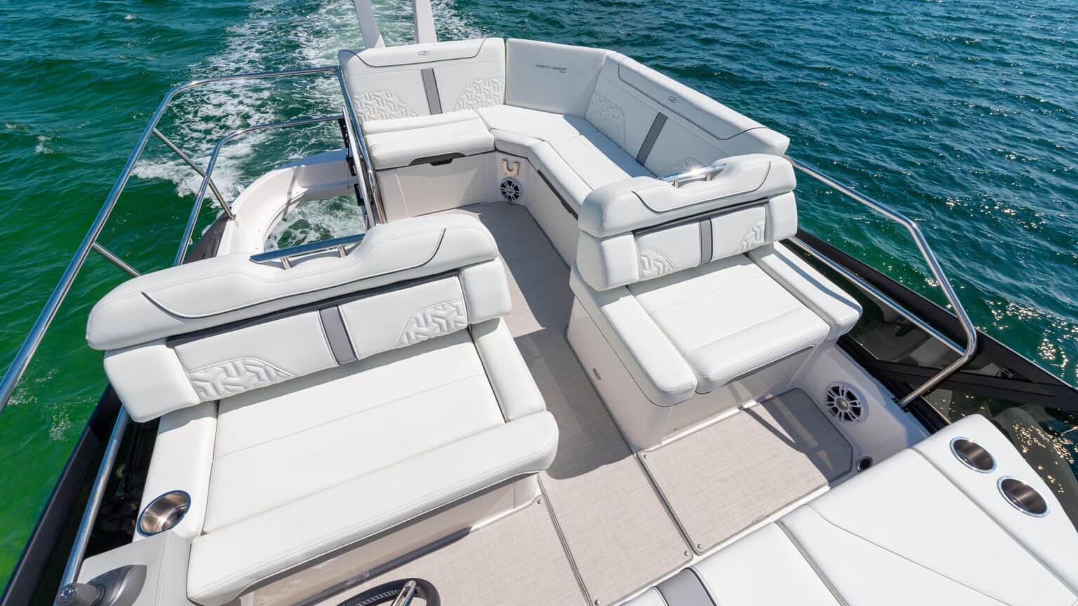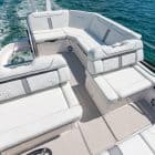 L-Shaped Seating – Aft and starboard L-shaped seating with removable section for foredeck or docking access.